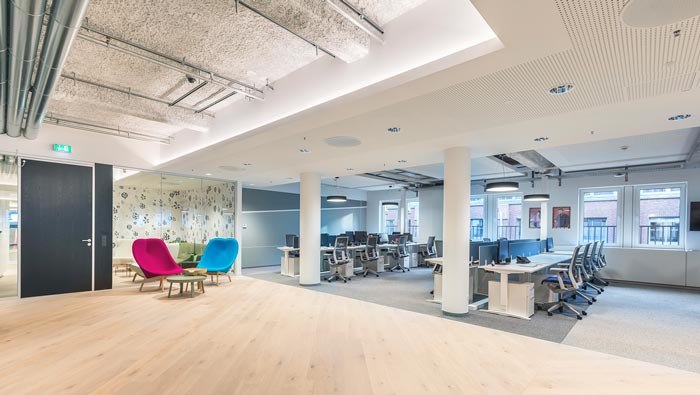 辦公區域的設計:因為空間本身有一些柱體存在,且無法去除,在此基礎上設計師利用色彩、材質的不同,以柱體為分割點將空間一分為二,但是在兩個空間之間卻沒有實體的任何材質,這也是設計師的高明之處,這樣一方面去除了柱體對于空間的影響,同時空間的通暢性也大大提升。