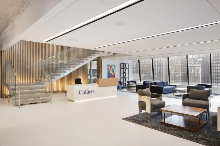 這是一個5500方的辦公室,整體空間寬敞明亮。整個空間設(shè)計都凸出體現(xiàn)了公司的品牌,同時還采用了極簡主義的色調(diào)和紋理。大理石面板從電梯大廳一直延伸到白色、淺灰色和藍(lán)色的輕盈背景中。