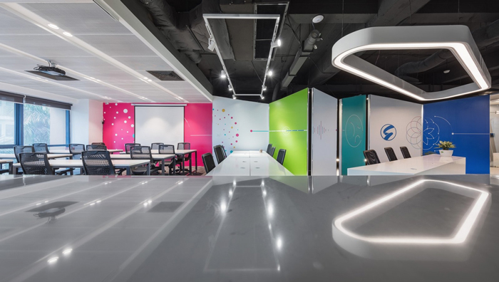 會議室的設計:此處就是剛剛大會議室與小會議結合的空間,在這里可以看出設計師對于設計的靈活使用,一個小小的轱轆讓整個設計都動了起來,設計師需要的就是這樣的效果,設計師希望讓設計活過來,讓企業對此處空間可以隨意的進行組合,達到高效辦公的初衷,這也是設計師給大家的意外之喜。