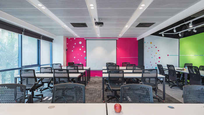 大會議室的設計:本次設計設計師參考了教室的布局模式,這也是設計師不得已而為之,由于空間的面積十分有限,故此設計師只能采用比較保守的設計,以此設計可以順利的進行下去,同時設計師在原有的基礎上,增加了自己對于光學的認識,目的就是希望在保守之際,為空間帶來一絲生機。