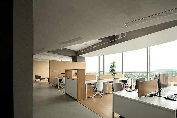 企業產品專注可持續性人工種植,主設計師對此表達為生態的感觀,提煉企業產品紗線最源頭的木材做為空間木飾面,同時希望在水泥墻面的深淺交錯的映襯。