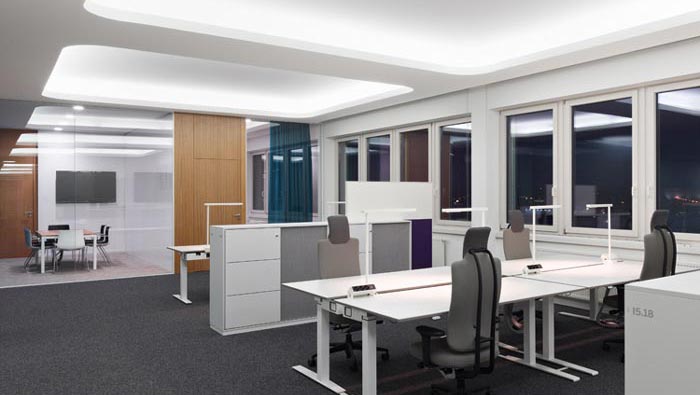辦公區域的設計:設計師在設計的時候,在采用開放式辦公的同時,以儲存柜代替隔斷將每一個辦公工位進行隔離,在設計師看來這樣的設計可以有效的彌補開放式的缺點,同時讓空間看起來更加有層次感,儲藏柜的設置也很好的解決了空間容納的缺憾,真是一舉兩得。