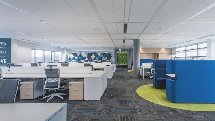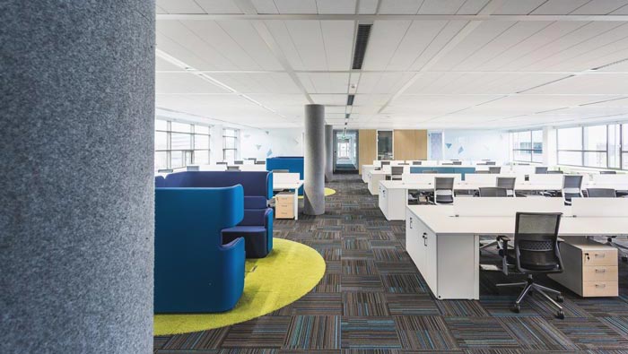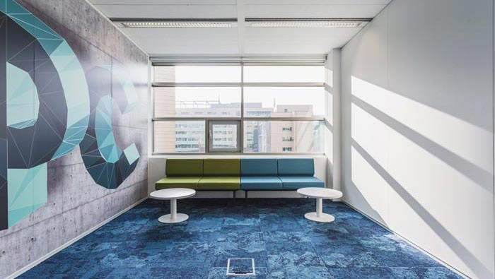 大辦公室的設計:設計師在設計的時候,將其安置在一個大的開放空間之中,設計師采用取中的設計原則,在設計師看來取中可以將思緒全部集中在會議區域,同時地毯設計師采用了類似海洋的顏色,以此寓意企業順風順水,同時這樣的設計將此處的向心力更加集中于中間部位,不會因為分散導致空間顯得空曠。