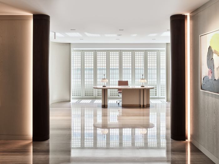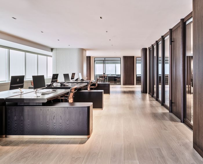 所有的辦公室都是開放式設(shè)計,透明玻璃門劃分了工作區(qū)域。從接待區(qū)到工作區(qū),木材材料逐漸使用,所以整個辦公室的調(diào)色板以米色和棕色為主。該項目的主要棕色色調(diào)以木質(zhì)元素和 大理石細節(jié)為特色。