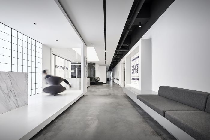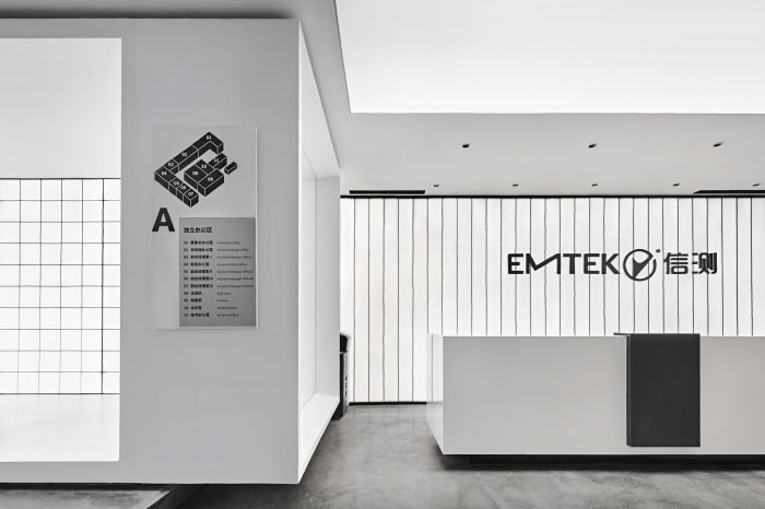 這是一個檢測科技公司辦公室的設計,有1000方的面積。設計師在重新設計品牌空間時,通過延續黑白灰的基調,加入對立、沖突的元素,消解空間軸線的刻意規律感。