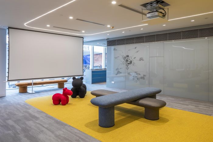 他們試圖打造一個能展現企業文化并能激發團隊熱情的辦公場所。所以空間減少了實體隔墻,以展現開放的辦公文化。運用塊面色彩、幾何形式、通透的玻璃隔墻去界定各功能區域,形成沒有視覺阻隔的開敞空間感。這樣的設計也正好契合公司致力于互動與協作的工作精神。