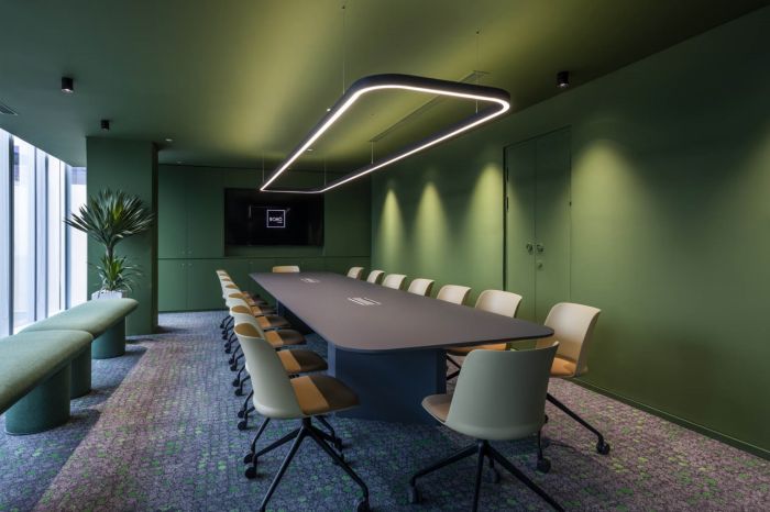 設計師將公共空間如接待處、服務臺、大廳廊道和文印室統統歸攏到一個稱為“核心”的中央空間。工作區圍繞這處核心空間展開,引導人們的視線都集中朝向核心區。這種向心點的設計手法目的是體現公司的協作京生。