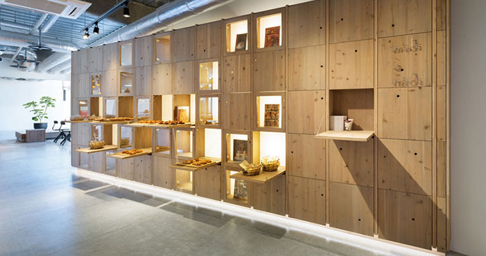 設計理念:店內色調素雅,以木質材料為主,簡約且現代化。選擇開放式的廚房,表現出所有的面包糕點都是新鮮出爐。天花板直接將設備管線裸露,各類風格迥異的吊燈設計也透露一股現代工業氣。提供了三種不同類型的座位:吧臺型、公共長桌型和榻榻米風格的坐席,供顧客自由選擇。設計了一個類似集裝箱的展示平臺,為了展示不同類型的點心,希望鼓勵通過這個平臺讓顧客發現自己想吃什么最值得一提的是,這家簡約風格的糕點店,特意為顧客設計了一塊閱讀區域,就像圖書館一樣,提供各類書籍。在享受美味的同時還能豐富精神食糧,這樣的小店雅致,美好!