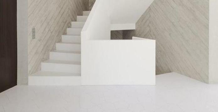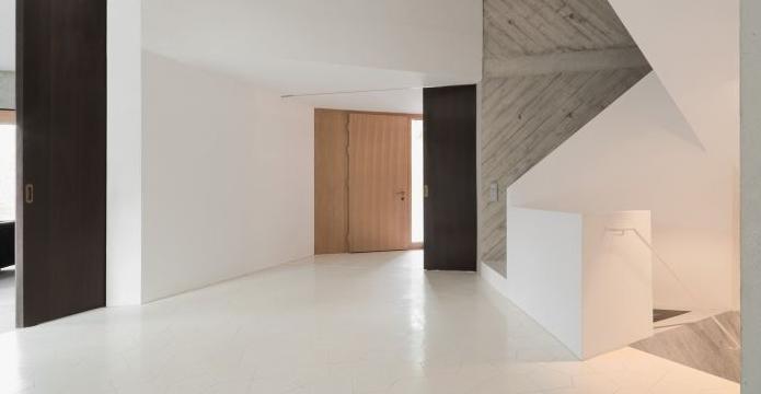 形式的統一體現在材料的統一上。厚厚的超輕質混凝土自絕緣墻表面光滑并帶有紋理,而屋頂的底面則用粗糙的木板制成,強調了各個表面的方向。入口區域的地面上鋪了對角圖案的奶白色多邊形瓷磚。這些柔和的表面調和了奶白色石膏、灰色石頭和地毯的中性色調,以及橡木和煙熏橡木飾物的自然色調。