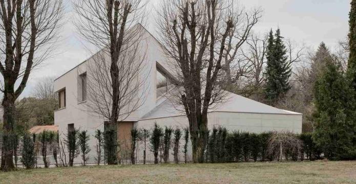 水晶體的形狀從周圍的建筑物中得到的靈感,20世紀30年代的四坡屋頂矗立在大花園的一角的緊湊單體房屋。在這里,六邊形體塊是傾斜的,為在西北的車庫留出空間,并為南面留出一個寬敞的花園。平面圍繞一個菱形樓梯井展開,樓梯井是承重核心筒,并融入了中央服務軸線之中。房間圍繞這個中心元素布置,并且每個房間都通向不同的外部空間。
