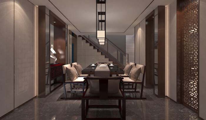 設計理念:此新中式別墅裝修設計,吸取了傳統裝飾‘’形‘神’的特征,糅合現代西式家居的舒適。