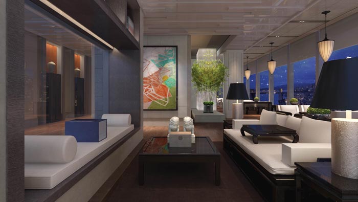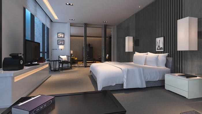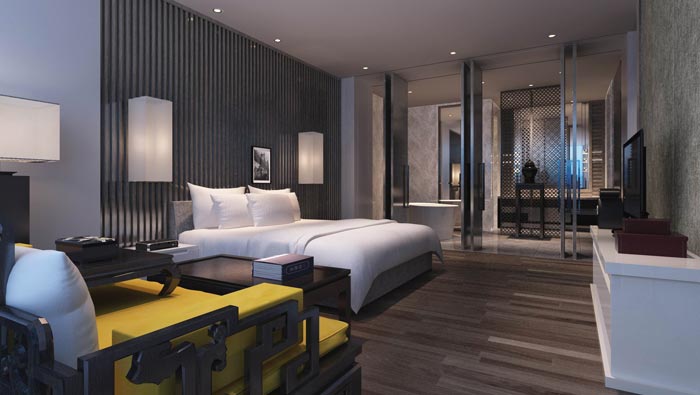 套房的設(shè)計:活動隔斷門將空間一分為二,一邊為休息區(qū)、一邊為洗浴區(qū),客戶在洗浴區(qū)褪去一身疲憊的時候,漫步走進客房,此時活動門會慢慢的關(guān)閉,因為此活動門是可以遙控關(guān)閉的,設(shè)計師希望讓客戶在這里享受到自動化的服務(wù),讓客戶享受到古代元素+現(xiàn)代元素結(jié)合的空間設(shè)計。