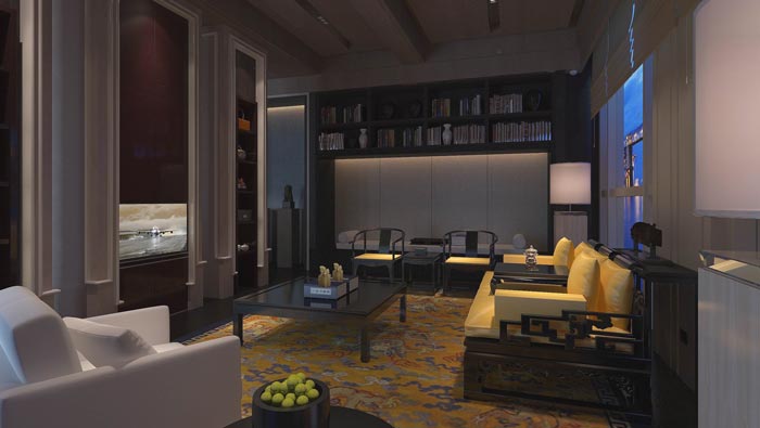 客廳的設(shè)計:進門后客戶首先看到的就是《三國演義》的原著書籍,四大名著對于國人來說,相信對于每一個人來說,都是一個兒時美好的回憶,設(shè)計師希望讓客戶可以在這里重溫自己的童年,重溫那段歷史,讓客戶在閱讀中以不同的角度去看待兒時的那份回憶。