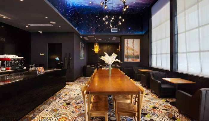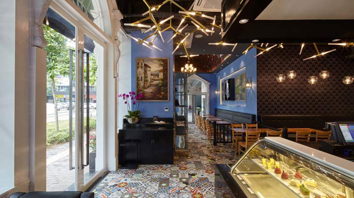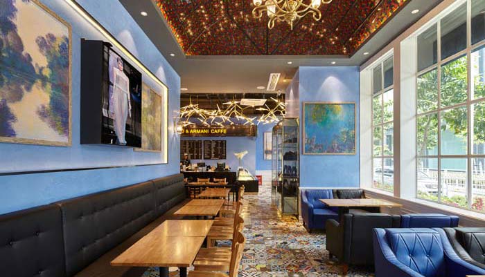 延續(xù)了英國尼祿咖啡的經(jīng)典色彩,融入意大利的古典建筑元素,結(jié)合阿瑪尼的時(shí)尚、簡約設(shè)計(jì)元素,再加入繪畫藝術(shù)元素。