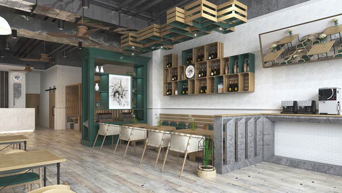 街角的咖啡店色彩設計:縱觀空間可以發現這里的色彩以深綠色、淺黃色為主,這里給人的第一感覺就是一種回憶的顏色,在這里大家回憶著曾經的過往,在這里完成一次心靈的沉淀。