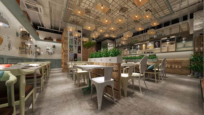 烤魚燒烤店裝飾設計:綠植為空間帶來綠色與自然,音樂為空間帶來旋律與活力,柔和的燈光為空間營造了浪漫的氛圍,整個相互交互在一切,營造一個優質的就餐環境。