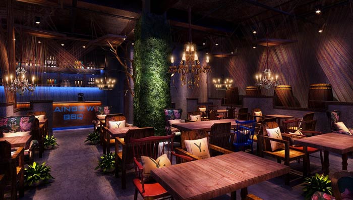 燒烤店進門區(qū)裝修設(shè)計:客戶進門首先看到的就是BBQ,BBQ是西方的燒烤大會,與中國的燒烤類似,這里集合了中國的燒烤,與西方的燒烤,讓客戶在這里享受到不一樣的風(fēng)味。