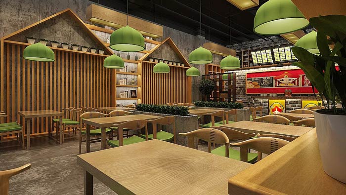 中式快餐店燈飾設計:綠色的燈罩、綠色的綠植、綠色的餐椅,一切的綠色設計是希望給客戶一種綠色的概念,這里的食物都是綠色無污染的,讓客戶在這里吃的放心、吃的安心。