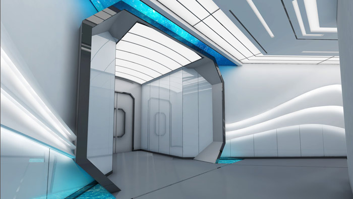 教育機構過道設計:當我們走進內部空間之后,會發現我們仿佛走進了宇宙飛船一般,銀色與星際力量成為設計的主色調,就是希望讓想象與創新達到一致,與企業教育屬性想和,這樣的設計也更能提升孩子的想象力。