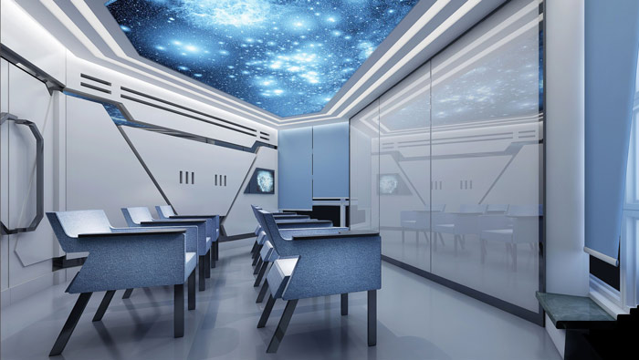 教育機構VIP教室設計:漫天的繁星讓我們仿佛身在宇宙當中,教室被設計師設計成宇宙飛船的模樣,這樣讓學員仿佛置身在宇宙的深處,去體會宇宙變化的萬象,一步一步引導學員進行深層次的思考。