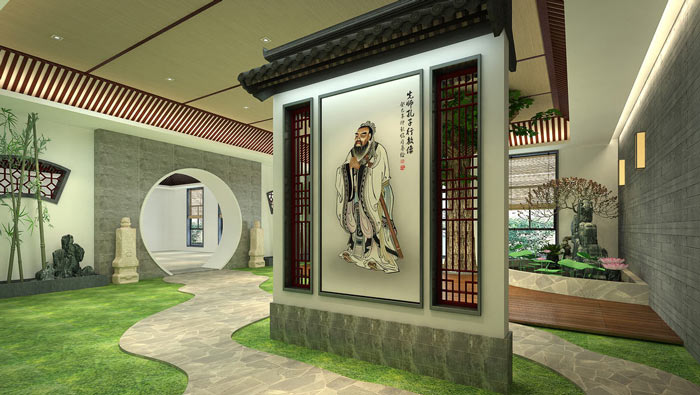 書法教育培訓機構庭院設計:至圣先師的畫像佇立在庭院的正中央,為空間增添了莊重之感,自然的景色更顯書法的飄逸與自然。