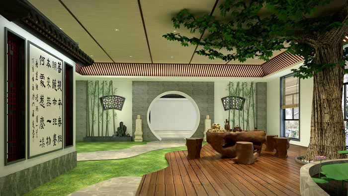 書法教育培訓機構庭院設計:菩提本無樹,明鏡亦非臺,本來無一物,何處惹塵埃,四局偈語表現(xiàn)的即是書法也是道理,表示書法的博大精深。