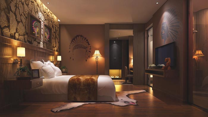 客房的設計:此次描繪的是日出而作、日落而息的場景,在這里讓戀人體會的是生活的艱辛,但在生活的艱辛之后感受到的是彼此之間的依賴,此處是希望戀人之間可以相互依存、相互幫助,不管遇到多大的困難,也要彼此共同面對,此處雙方的是勇氣,是勇敢面對困苦的勇氣。
