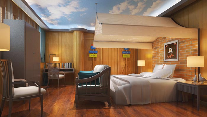 客房的設計:此處描繪的是彼此都已為人父、人母,讓戀人相互計劃自己孩子的未來,在這里讓戀人明白責任的重要,在這里雙人共同規劃了自己的未來,在未來的某一天彼此再來到此處,給人的感覺可想而知,在此次設計師希望讓戀人學會規劃自己的未來。