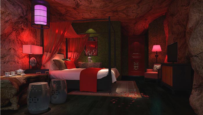 曠古奇緣客房的設計:相信每一個人都有一個穿越的夢想,都想穿越到過去用自己的本事,建造一份功業并遇到自己的紅顏知己,戀人們進入空間之后,就仿佛與現世脫離,穿越到了五百年前,在這里設計師希望戀人們可以真切的體驗一次古代的愛情,讓彼此之間的感情可以更上一層樓。