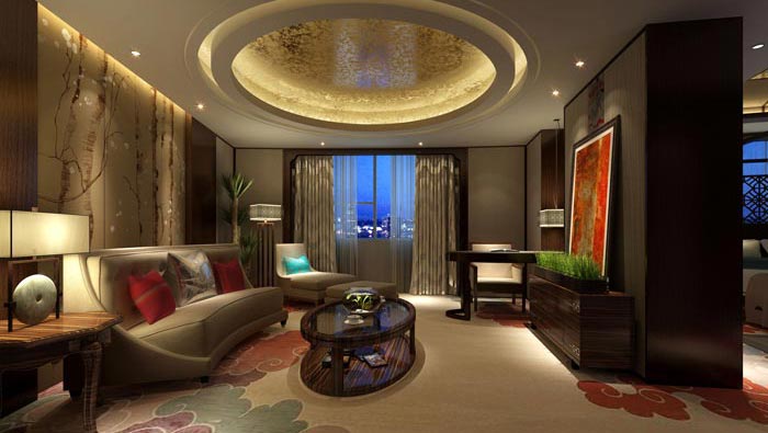 套房客廳的設計:在顧客勞累了一天之后,最需要的就是擁有一個自己的空間,當客戶進入客廳之后,首先感受到的就是家庭的溫暖,在此處顧客可以坐在沙發(fā)上發(fā)發(fā)呆,好好的休息一下,在設計師看來什么都不想、什么都不做,是商務人士恢復的最好途徑,同時顧客也可以在這里俯視城市的美景,讓自己勞累的身心得到釋放。