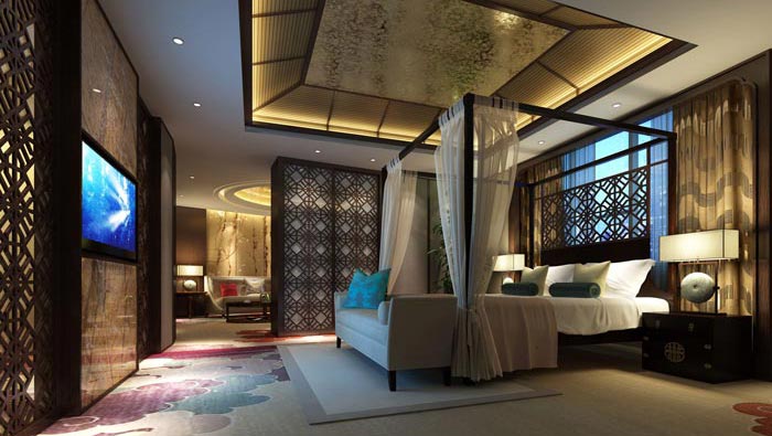 套房臥室的設計:當顧客進入臥室之后,首先感受到的就是溫馨,這里結(jié)合了中式的設計風格,在這里人的精神將進入一個深層次的休眠當中,這樣有利于精神得到更好的恢復,當客戶躺在床上之后,會感覺到月光透過窗戶照在臉龐之上,這感覺真是愜意,月光如少女的手拂過顧客的臉龐,讓人熟睡,撫平傷痕累累的內(nèi)心。