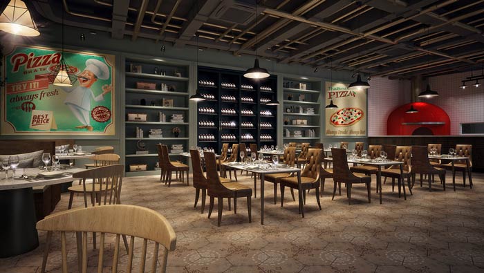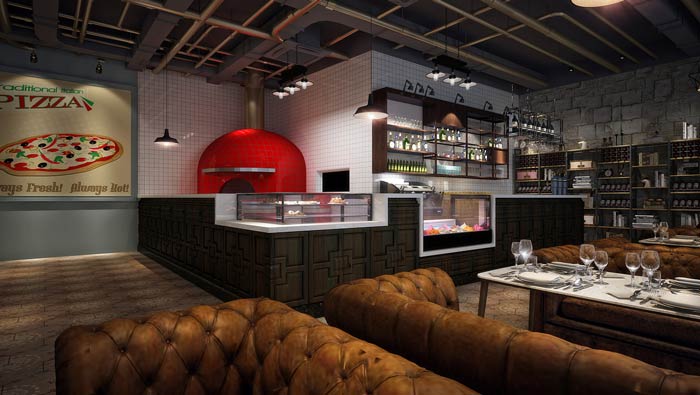 披薩西餐廳吧臺裝修設計:這里是客戶點食品的地方,墻上大大的披薩,真可謂是色香味俱全,讓人忍不住想要嘗試一番,這是通過既視感,讓客戶對餐廳有一個主觀的認識。