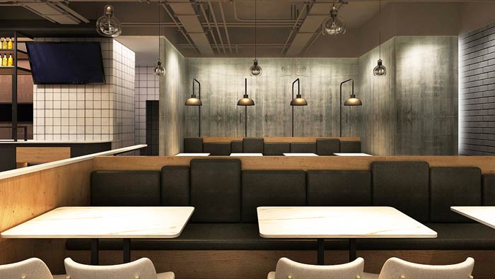主題西餐廳裝修設計:白色的餐桌、白色的餐椅、灰色的長版沙發、藝術感的燈飾,一切的一切都是在點綴整個空間,讓空間更有特色,滿足、優化相互交織。