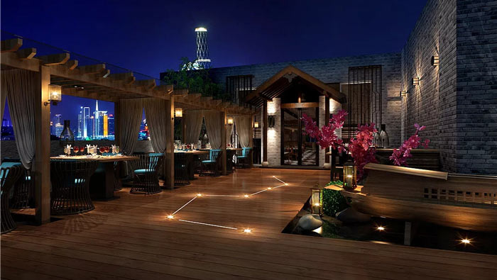 中式餐廳陽臺設計:北斗七星經過燈光的特殊處理重現在人間,這讓我們仿佛自身與天上人間一般,在這里現實與古代融為一體,讓人感受到不一樣的就餐環境。