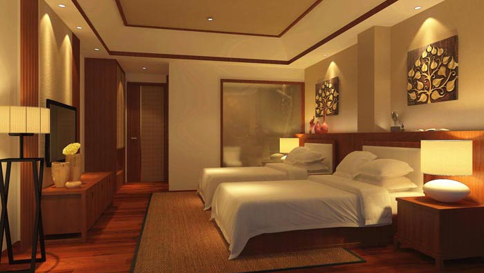 雙人間的設(shè)計(jì):在雙人間的設(shè)計(jì)上面,設(shè)計(jì)師認(rèn)為最重要的就是完善各自之間的距離,因?yàn)閮蓚€(gè)人與一個(gè)人總歸是有很大的不同,在這里床的位置十分重要,因?yàn)榧炔荒芡怀瞿莻€(gè),也不能忽略哪一個(gè),所以空間的平衡非常重要,這就要求設(shè)計(jì)師在設(shè)計(jì)中,需要對(duì)格局進(jìn)行不斷的調(diào)整與嘗試,目的就是希望達(dá)到一種動(dòng)態(tài)的平衡。