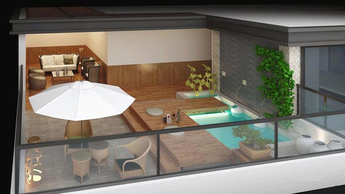 頂層溫泉的設(shè)計(jì):此處主要是為勞累了一天的客戶們,提供一處休閑之地,讓大家在這里可以泡泡澡、喝喝茶、嘮嘮嗑、談?wù)勆睿谶@里休閑達(dá)到一種頂峰,此處旨在去除人的疲勞,此處也是酒店的一大亮點(diǎn),酒店的理念就是在任何時(shí)候,都可以為客戶帶來驚喜。