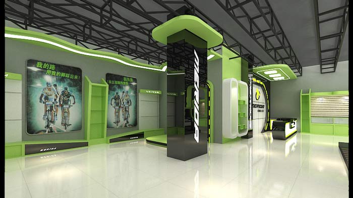 設(shè)計(jì)理念:設(shè)計(jì)師在美利達(dá)自行車專賣店裝修設(shè)計(jì)的時(shí)候,整體方案色彩以淡綠色和熒光綠的色調(diào),造型以流線型和倒圓角的造型,在實(shí)用型和美觀型很有效果!